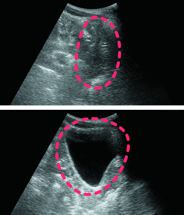 超音波診断装置でとらえた膀胱のエコー画像。上は膀胱に尿がたまっておらず収縮している状態で、下は膀胱に水分がたまり膨らんでいる状態。DFreeはこの違いを検知している