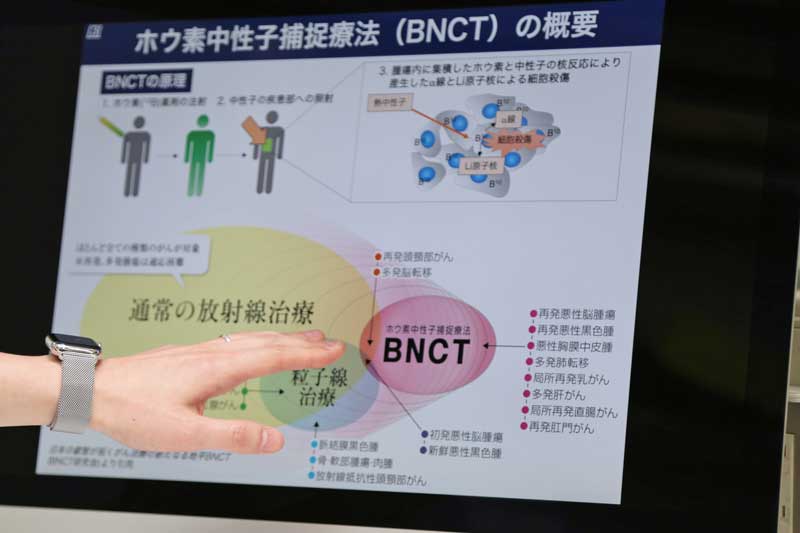 「BNCTは、体内に入れたホウ素化合物(BPA)に中性子線を照射することで起きる核反応を利用し、がん細胞を死滅させようという治療法です。ホウ素化合物は人体への影響がほとんどなく、治療に使われる熱中性子もエネルギー自体はとても低いため、単体で使っても効果はありません。ところが、この2つを組み合わせると核反応を起こし、アルファ粒子とリチウム反跳(はんちょう)核による高いエネルギーが生じて、がん細胞に強いダメージを与えるのです」