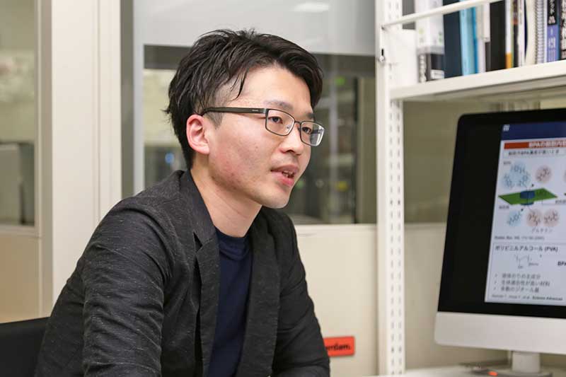 「従来のホウ素化合物に加える高分子にはどのような構造が理想的かを考えて、試しにポリビニルアルコールの構造式を書いてみたところ、スライムの化学式とそっくりだったんですね。素材としての適性をはじめ、将来的な実現可能性なども含めて、とても相性が良かったのです。今回の発見は、いくつもの構造を考え抜いた結果でした」