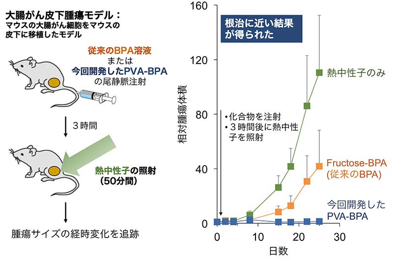 マウスの大腸がん細胞を皮下に移植したモデルでは、野本助教らが開発したポリビニルアルコールを結合させた薬剤を使用すると、治療開始から25日を経過しても腫瘍の体積に変化が見られず、根治に近い結果を得ている
