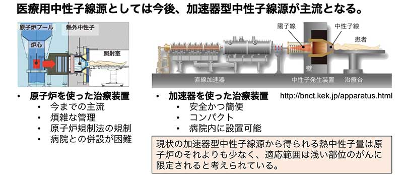 BNCTの中性子線源はこれまでの原子炉型から、より安全で簡便、コンパクトな加速器型に移行しつつある