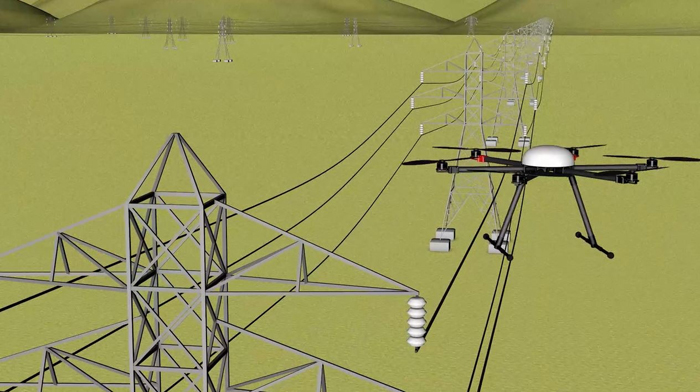 送電線に沿って安全に飛行する、ドローンのイメージ図。東京電力HDの送電鉄塔は約5万基、送電線の長さは約1万5000kmにも及ぶ