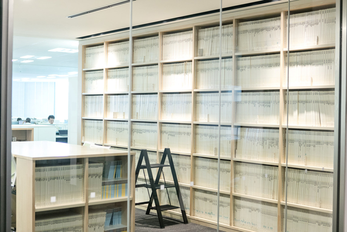 オフィス内の書棚には、調査スタッフの英知が詰まった住宅地図が整然と収められている
