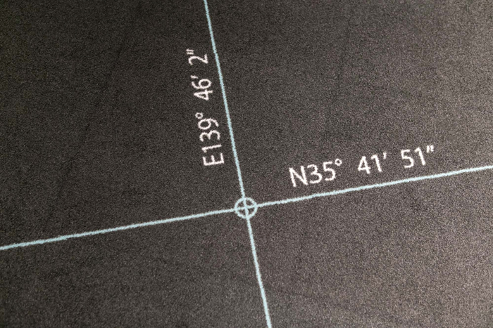 ゼンリン東京本社の受付ロビーのフロアには、同社の実際の緯度と経度が記されている