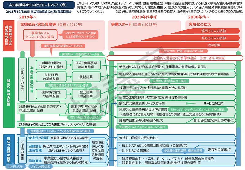 「空の移動革命に向けた官民協議会」第4回会議で検討された「空の移動革命に向けたロードマップ(案)」。2020年代半ばには事業スタート、2030年代からは実用化の拡大に向けた道筋が示されている。SkyDriveは同協議会に民間のリーディングカンパニーという立場で参加