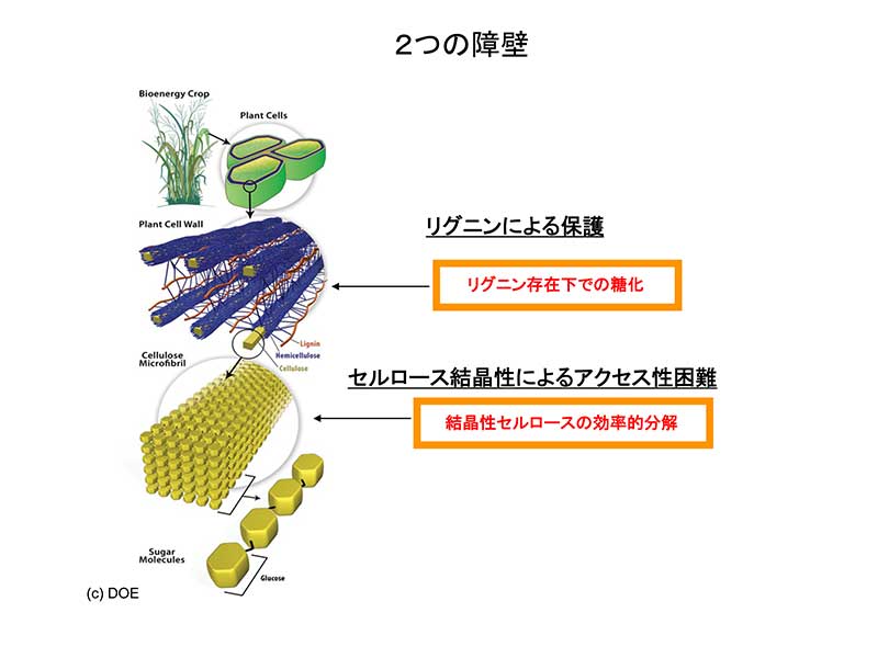 だが、木質を分解し、そこからエネルギー源を得るのは、実はとても難しい。樹木は光合成を行って太陽光と二酸化炭素から糖(エネルギー源)を作り出しているが、その本体であるリグノセルロースという高分子混合物はとても強固な結晶構造になっており、分解することが難しいのだ。もともと分解されやすい穀類のデンプンを使うものとは、そこが異なる。