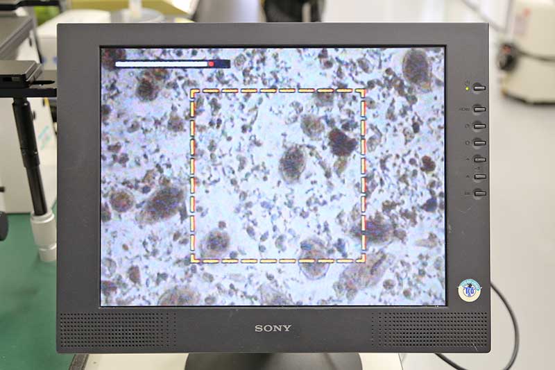 取材時、シロアリの腸内にいる原生動物を取り出し、顕微鏡で拡大して見せてもらった。最初は元気よく活動しているが、みるみる動きが止まっていった。シロアリの腸内以外では生存できない生物なのだという