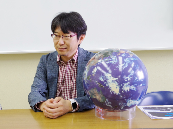 気象衛星NOAAの観測データを、東海大学情報技術センターで画像処理した地球儀を持つ佐藤氏。「人が想像して、できると思ったものは絶対できるんです」と宇宙エレベーターへの思いを熱く語る