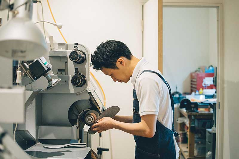 中間層はウレタンのクッション、一番上は和紙から作られた吸湿性・防臭性に優れた特別な生地を使用。芯材の成型には3Dプリンターを用いるが、3つの部材を接着し、最終的に形を整える作業は職人が手仕事で行っているという。