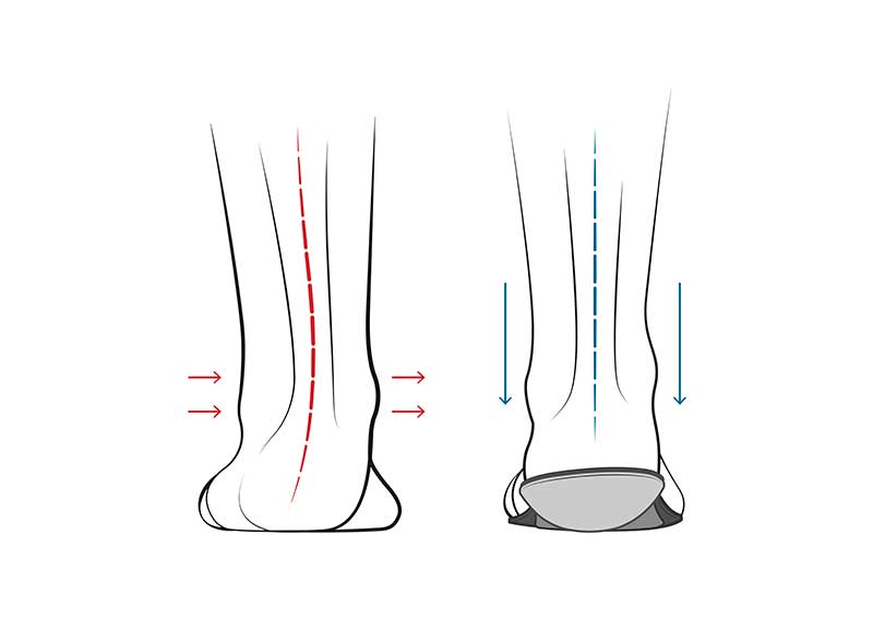 樹脂製の芯材(右側グレー部分)で足裏の接地する部分を変え、かかとを支えて真っすぐにすることで歩行をサポート。自然と姿勢を整えようとするのだ