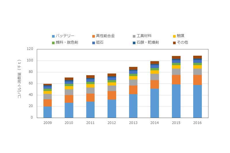 世界的なリチウムイオン電池の普及とともに、コバルトの消費量が増加。2016年時点での年間総消費量は11万t程度で、現在ではその需要はさらに増えている