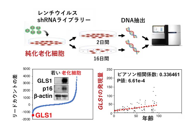 「単に外から観察しただけでは、どれが老化細胞なのか特定できません。そこでまずはp53という遺伝子が細胞分裂の特定の時期に活性化すると老化細胞が生じる事実を見つけ出し、恣意的に老化細胞を作成する方法を構築しました。この純化した老化細胞にレンチウイルスshRNAライブラリースクリーニングを用いて老化細胞の生存に必須の遺伝子をスクリーニングしたところ、グルタミン代謝を活性化する遺伝子GLS1を同定しました。こうした個々の先端技術進化が重なって、今回の発見につながっています」