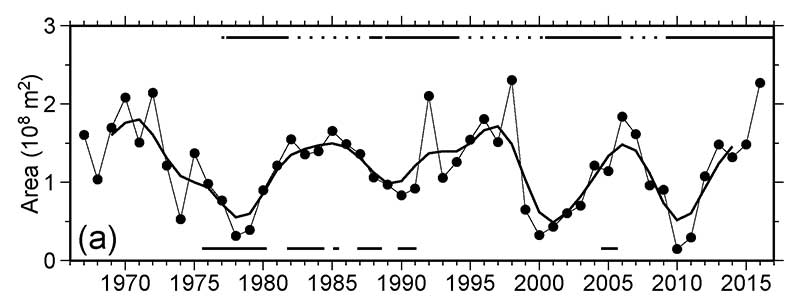 気象庁・東経137度線の冬の観測による、亜熱帯モード水の断面積の長期変化を示したグラフ。約10年ごとに大きな変動がある様子を見てとれる