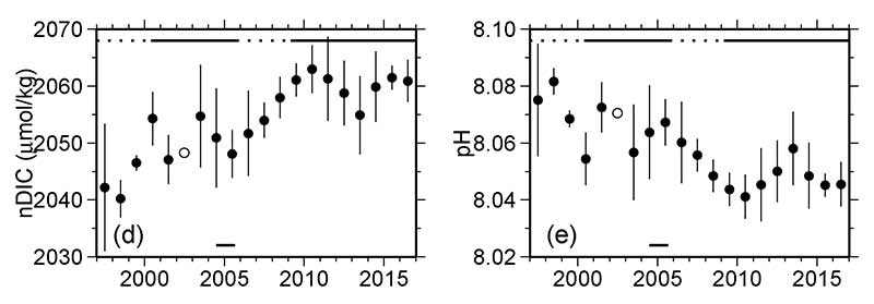 亜熱帯モード水の化学的性質を表す、(d)全炭酸濃度、(e)pHの長期変化を示したグラフ。全炭酸とは、CO2が海水に溶けてできる炭酸物質の総量のこと