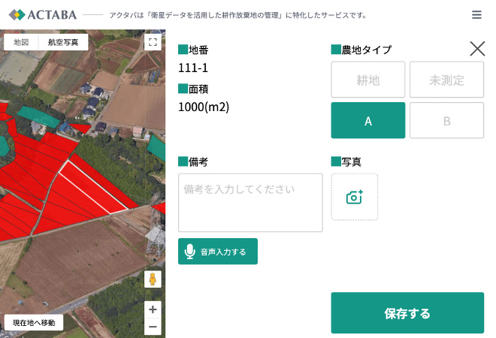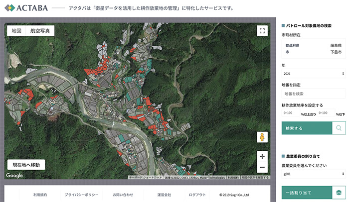 「アクタバ」のインターフェース。Google マップの地図に衛星画像から解析した情報を載せて表示することで、地方自治体の農業委員会の担当者が耕作放棄地のパトロール調査を行う目安や参考データになる