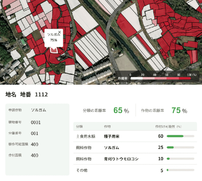 「デタバ」は衛星データを基に作付けされている作物を推定し、アプリ上に表示する。農地の所有者から申請されている作物と合っているかが一目で確認できる