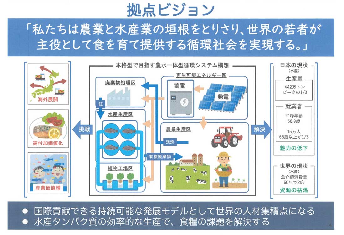 「拠点ビジョンに、その地域ごとで即した農業生産区(畑)と水産生産区(陸上養殖場)を当てはめて、再生可能エネルギーや環境調整システムなどのデジタル技術を駆使して連携します。そうすることで、その中で生まれる生産物や有機廃棄物を活用した、誰でも、どこでも安全に、安定した養殖を実現させる『完全閉鎖型の循環システム』を形成させます」
