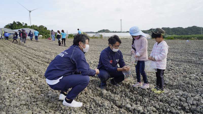 オリオンビールは沖縄産の大麦を原材料とし、県内の一次産業(農業)と二次産業(製造)の直接的な資源循環を目指し、沖縄モデルに参画。画像は沖縄県南城市で同社社員も参加した大麦の種まきの様子