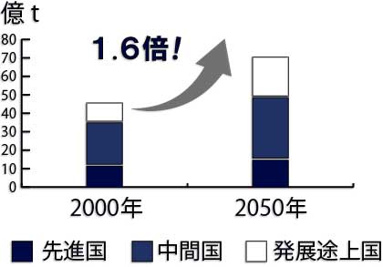 2000年と2050年の世界全体の食料需要の変化予測。世界全体の食料需要は50年間でおよそ1.5~1.7倍に膨れ上がると言われている