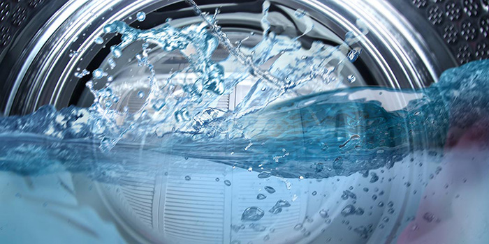 「wash+」で使われるアルカリイオン電解水は、界面活性剤などの合成化学物質を含まない無色・無臭の電解水。洗濯機の内部が泡立たないことが特徴。洗浄効果は一般の洗剤を使った場合と遜色なく、洗濯物を除菌する効果もある