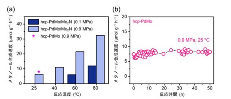 この化合物でメタノールを常圧(約1気圧)で合成したところ60℃以上で反応が進み、25℃の室温では約9気圧の圧力下で継続的にメタノールが合成された。