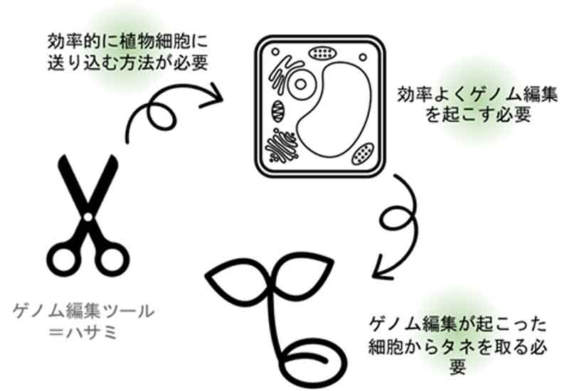 ゲノム編集ツールによる品種改良のプロセス。この流れをさまざまな品種で行うには技術的な難しさがあり、これまで農作物での利用促進を阻む課題となっていた