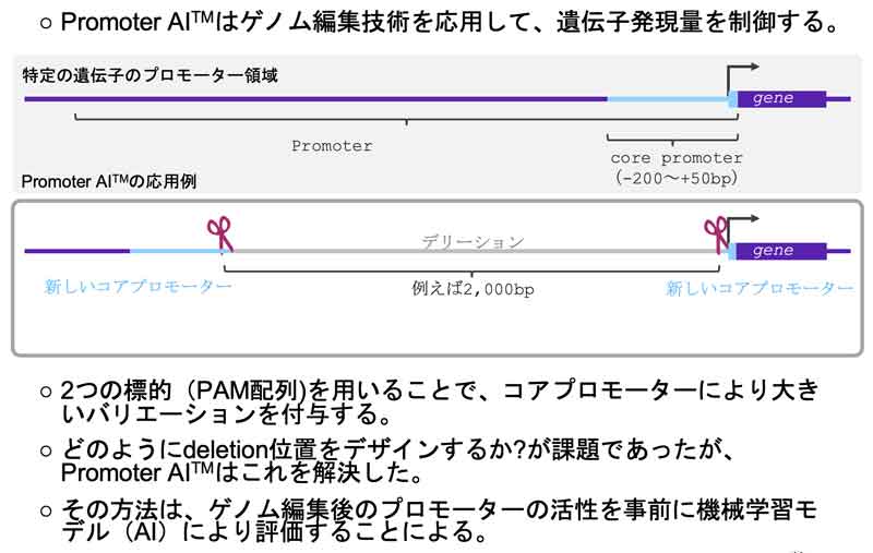 同社は今後、品種改良の効率化をさらに進めるため、ゲノム編集後のプロモーター(遺伝子の発現)量をAIで予測するシステム「Promoter AITM」を開発。その効果を実証し、一定の成果を上げている。