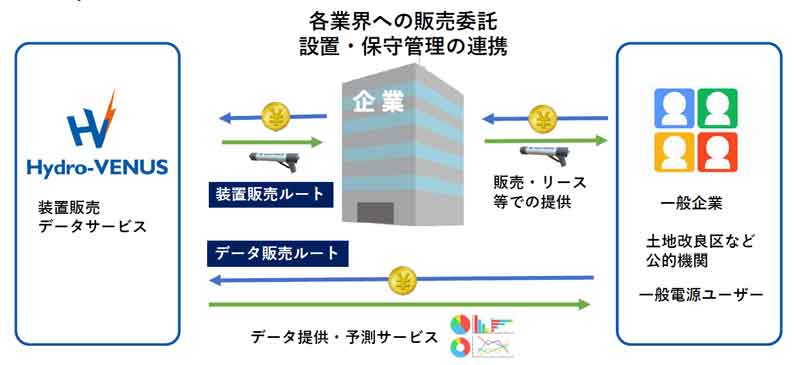 ハイドロヴィーナスが現在、展開を進めるビジネスモデルのイメージ。発電はもちろんだが、データ取得・分析を大きなメリットとして多方面への展開を目指す