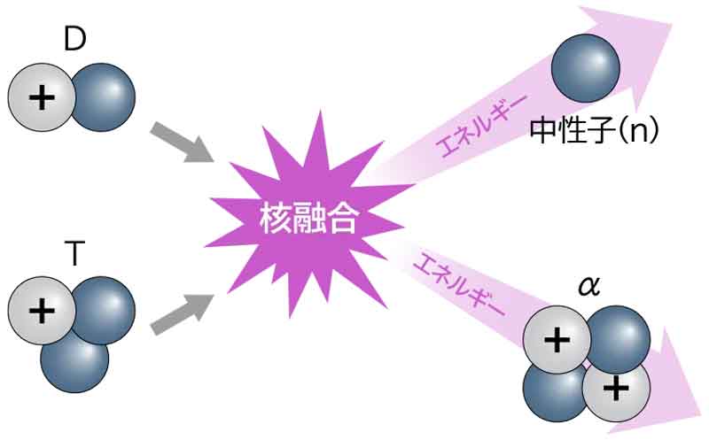 核融合で最もメジャーな反応は、水素(H)の同位体で海水に含まれる重水素(D)と、自然界に存在するトリチウム(三重水素・T)を融合させるD-T反応である。