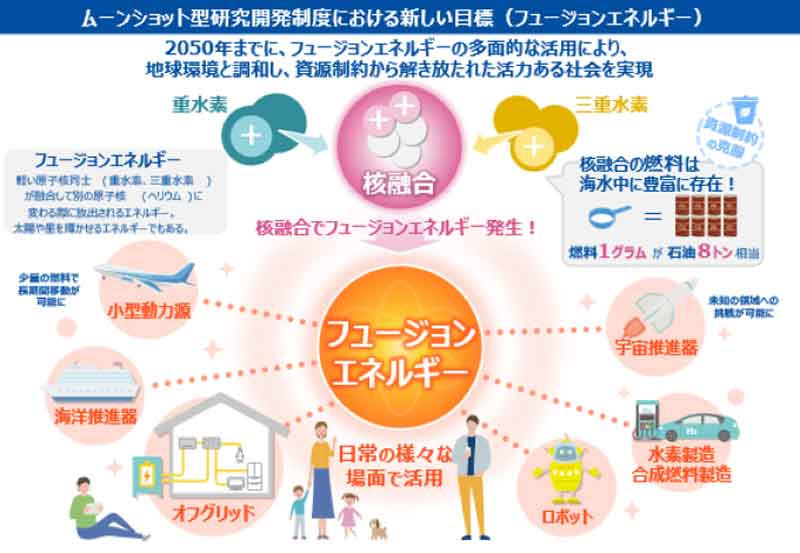 フュージョンエネルギーとは、端的に言うと軽い原子核同士が融合して別の原子核に変わる際に放出されるエネルギーのことを指す。いわゆる「核融合」のことで、同戦略では2030 年代の発電実証を目指すとしている。