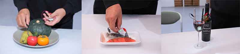 トマトやカボチャ、魚の切り身、ワインなど、超小集電技術はありとあらゆる食材からも微小な電気を集め、LEDライトをともしていく