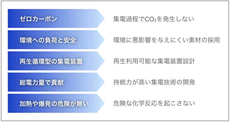 「環境への負荷が低いのはもちろん、集電材を持続的に使用することでコストが抑えられ、総電力量で社会に貢献できる他、複雑な化学反応も伴わないので集電装置の加熱や爆発の危険性がないこともメリットです」