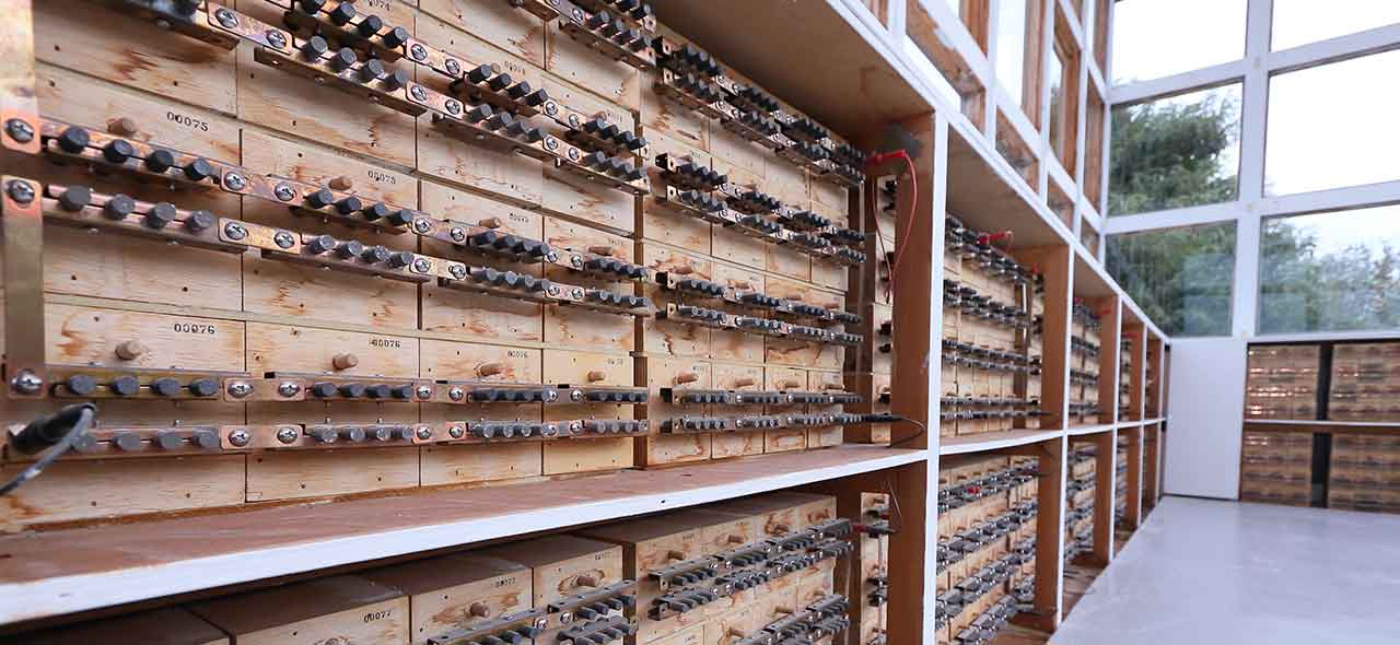 「LU-AN 琉庵」に設置された集電セル。「セルの筐体は配管を利用し、コンパクトに設計しました。こちらも地元企業にご協力をいただき、手作りで一つ一つに手作業で土を入れ、性能を調整して…とやはり地道な作業の上で完成しました」(中川氏)