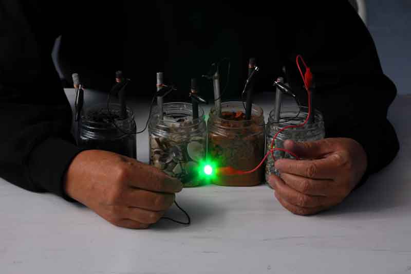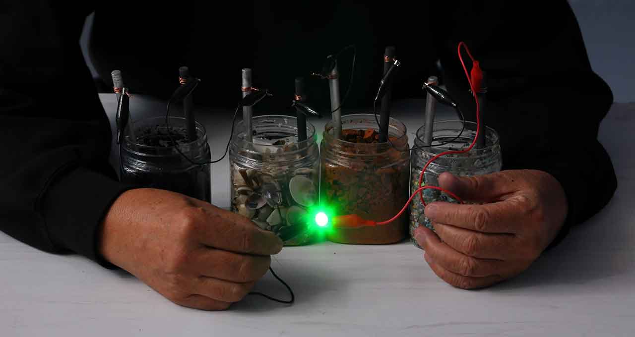 左から木炭、貝殻、レンガ、マイクロプラスチックをそれぞれ集電装置に詰め、直列につないでLEDライトをともす