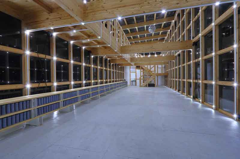 「LU-AN 琉庵」内部。「KU-AN 空庵」よりさらにLEDライトを増やし、生活を意識した空間に設計。より明るく、暖かみのある明かりを実現した。集電セルは壁面に配置し、独自開発のチャージシステムを構築。「2階構造にしたことで音響効果も良く、この夏にはコンサートなども催しました」(中川氏)