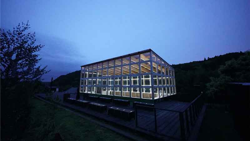 格子状の木造実験棟「KU-AN 空庵」。施設内の照明はすべて超小集電により点灯され、その空間自体がオフグリッドデザインのライフスタイルを象徴したものだ