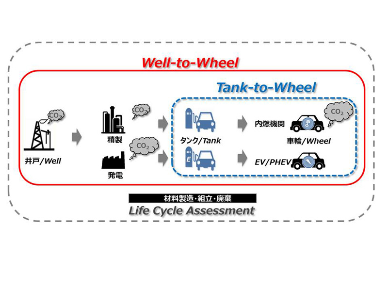 CO2排出量を、材料製造から組み立て、廃棄、そしてエネルギー源まで含めて総合的に計るWell-to-Wheelの概念図