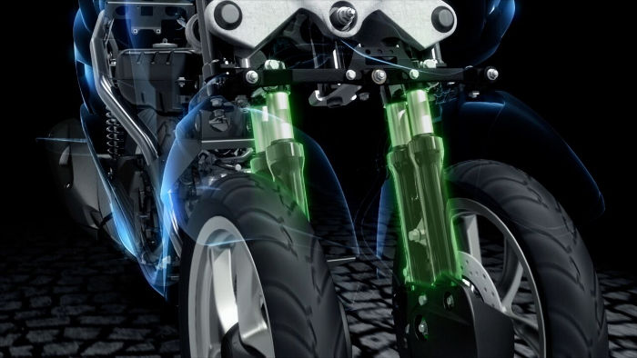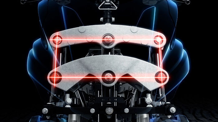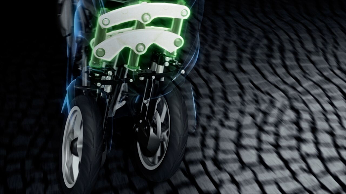 LMWは、前輪のフロントフォークを上下平行に保たれた2本のリンクによって接続。そのリンクの中心には軸が設置されており、車体を傾けると左右にスライドするような動きを見せる