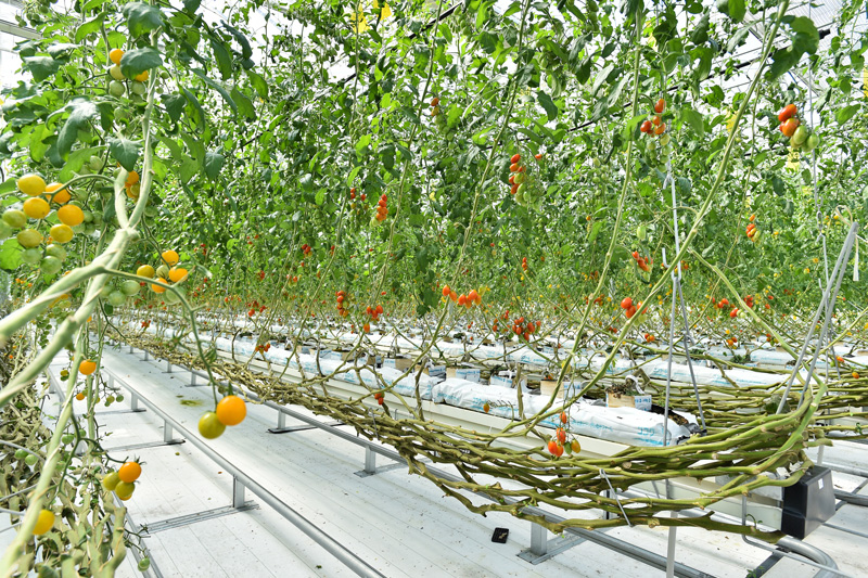 肝心のトマト生産は、敷地面積2.5haのハウスで行われている。約4万本の苗木が整然と並ぶ景色は圧巻! さらに、普通のハウスとの最大の違いは、足元に土がないことだ。