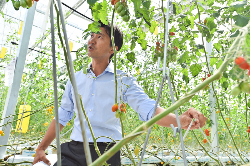 「スリランカ産のヤシ殻に植えた苗木に、養分を含んだ溶液を与える『養液栽培』という方法を採用しています。オランダ発祥の技術に独自の改良を加えました。ハウス内の温度や湿度、日射量から二酸化炭素濃度まであらゆる環境の制御をコンピューターで一元管理しています。トマトの生育状態にベストな気温や養分量でコントロールするため、計画的に生産することが可能です」