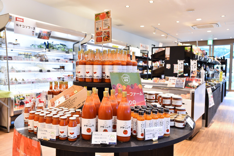 直売所では、トマトジュースやジャム、ピューレなど、こだわりの加工品をラインアップ。