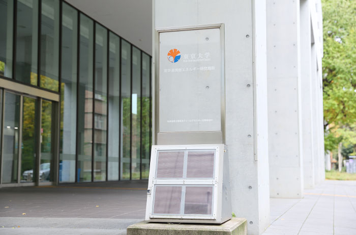 瀬川教授が所属する東京大学先端科学技術研究センターの看板。土台にはアイシン精機が開発した色素増感太陽電池を用いたソーラーパネルが設置されている