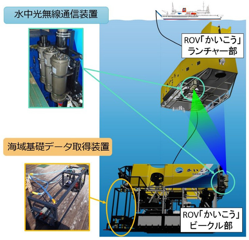 今回の実験では「かいこう」のランチャー部(親機)とビークル部(子機)の双方に水中光無線通信装置を搭載し、通信状態を確認しながら互いの距離を徐々に開けていく手法が採用された。