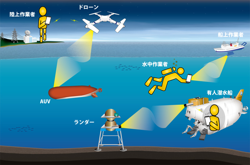 水中ビークルや海底ステーション、船舶、ドローンなどのあらゆる通信装置を無線LANでつなぐ“水中観測機器のIoT化”も可能だ