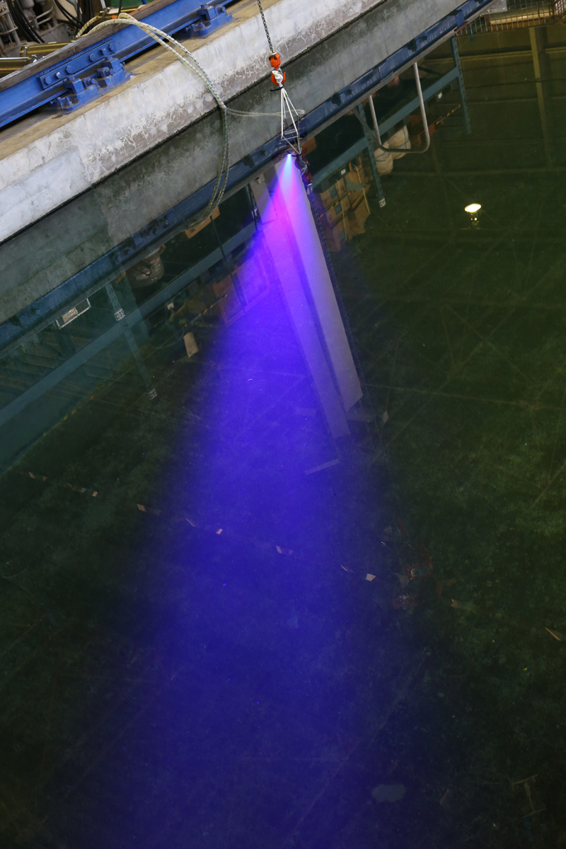 上の写真はJAMSTEC内の実験用プールにて、実際に海中で使用したのと同じ水中光無線通信装置からの発光を再現してもらったもの。写真では紫色に見えるが、肉眼では青色の鮮やかな光が水中を貫く様子が確認できた。※これはカメラと人間の目では光に対する感度が色によってそれぞれ異なるため