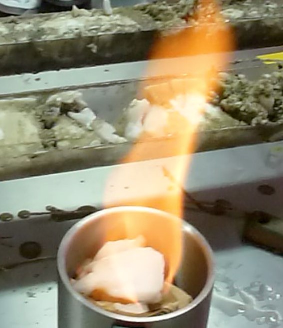 「燃える氷」メタンハイドレート。後ろに見えるのは、海底掘削で回収されたばかりのメタンハイドレート