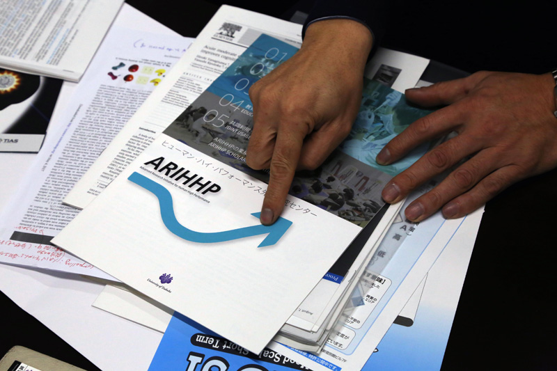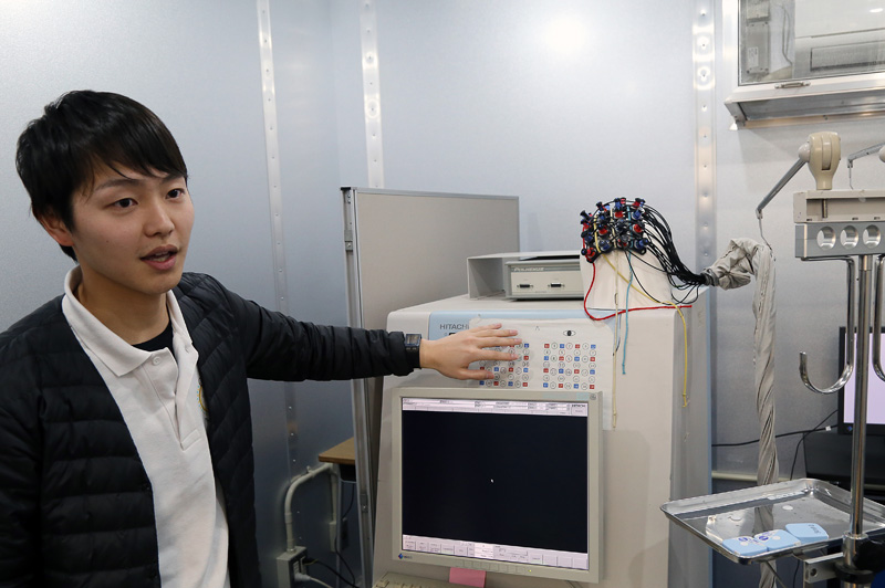 近赤外線を用いて脳の活動をマッピングする光トポグラフィという装置について説明してくれた征矢研究室 博士課程1年生の福家さん。ヒューマン・ハイ・パフォーマンス先端研究センターでは、このような最新鋭の実験装置を用いて認知機能を高める運動効果とそのメカニズムをニューロイメージング法から明らかにする実験を行っている