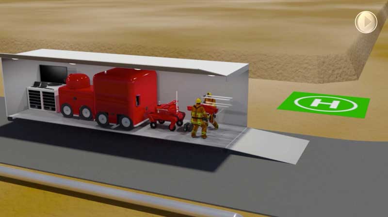 最初に、火災事故が発生した現場から十分離れた安全な場所にコンテナを載せたトラックが到着。コンテナの中には、4機のロボットを含むシステムすべてが集約されている。コンパクトなユニットとしたのは、あらゆる災害発生現場に対応できるようにするため、また配備の効率を見据えてのことだ。