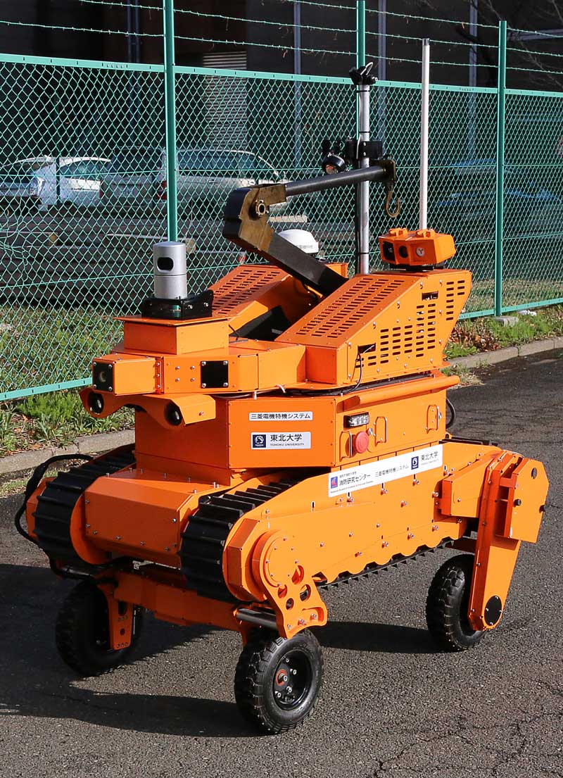 放水砲ロボットの移動ルートを探査する走行型偵察監視ロボット。瓦礫が散乱している不整地などでは、通常のタイヤ走行モードからクローラー走行モードへと変形する。大きな段差に対してはアームごと回転させるアクションで乗り越えることも可能だ