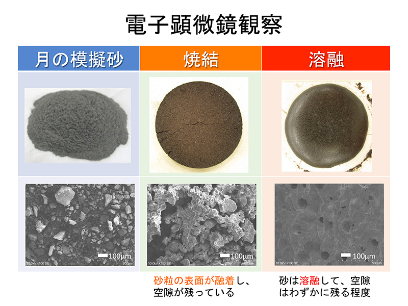 月の模擬砂をマイクロ波で焼成し、固化体を作る様子。1100度前後(画像中)では砂粒の表面が融着した焼結物に、それ以上の温度(画像右)では全体が溶けて固まった溶融物となる